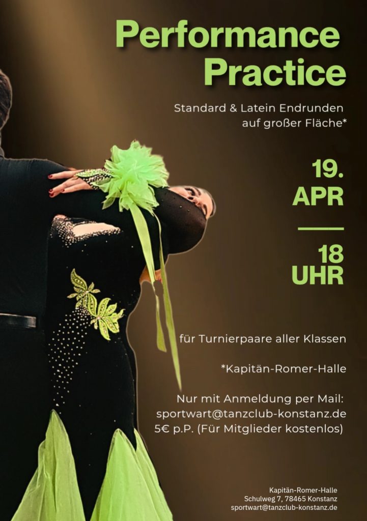 Um uns gemeinsam auf die bevorstehenden Turniere wie das Bodenseetanzfest und Hessen tanzt vorzubereiten, bietet der Tanzclub Konstanz ein Endrundentraining auf großer Fläche für Turnierstarter an. Dabei werden abwechselnd Endrunden