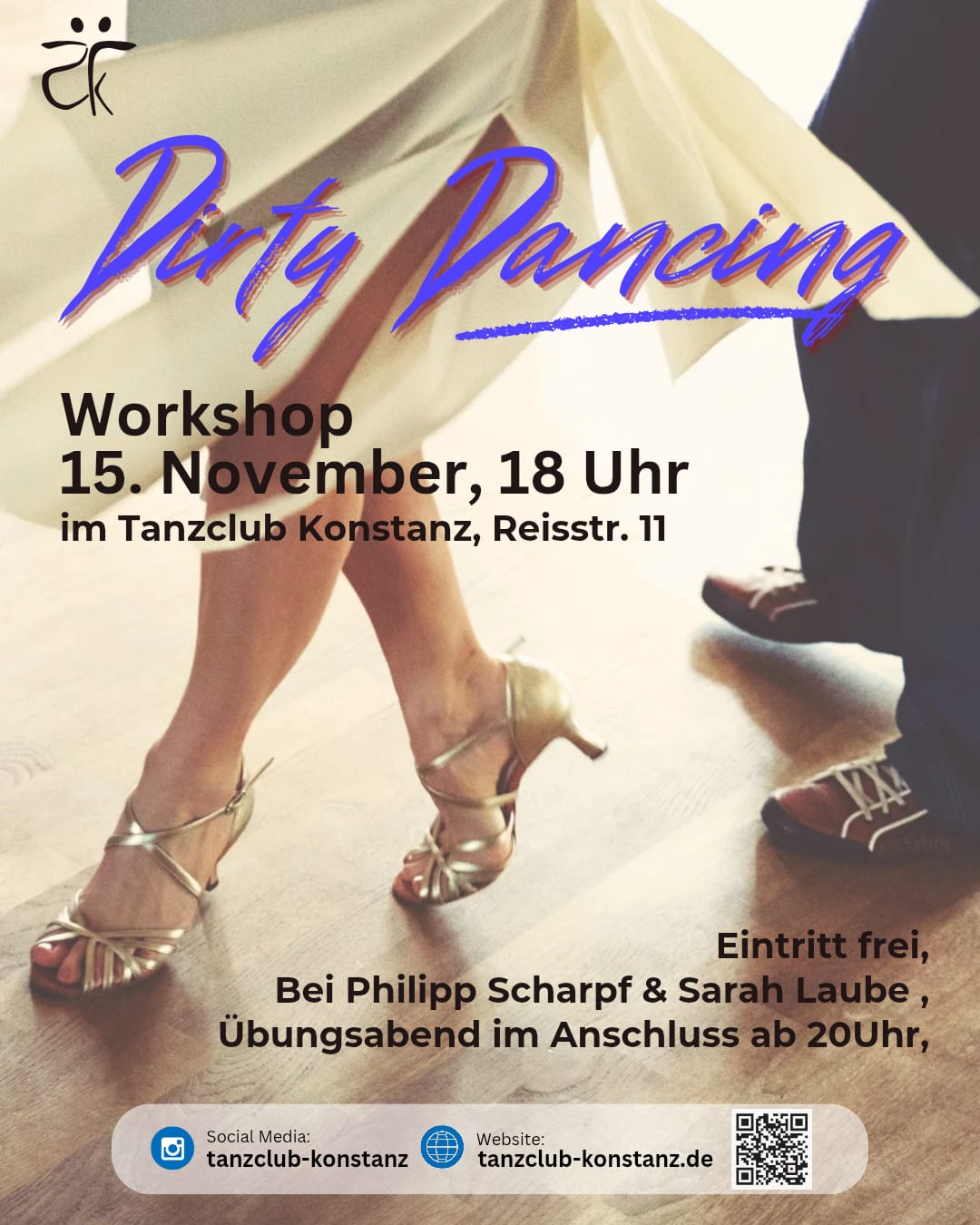 Am Samstag, dem 15. November, werden in diesem Workshop Salsa-Elemente zu den bekannten Choreografien aus dem Tanzfilm "Dirty Dancing" unterrichtet. Um am Workshop teilzunehmen, werden Salsa-Vorkenntnisse empfohlen.